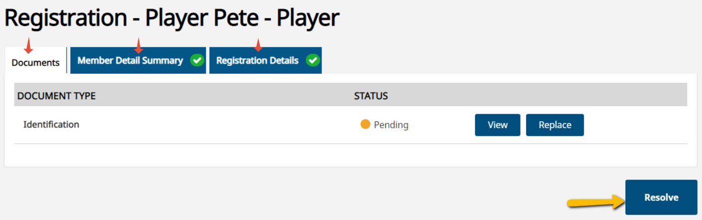Note: all Tabs (Documents, Member Detail Summary and Registration Details) must have been checked / clicked, so that Resolve button will be active.
