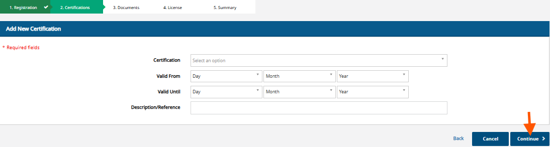 “No certifications are added at this stage. Select ‘Continue’.”