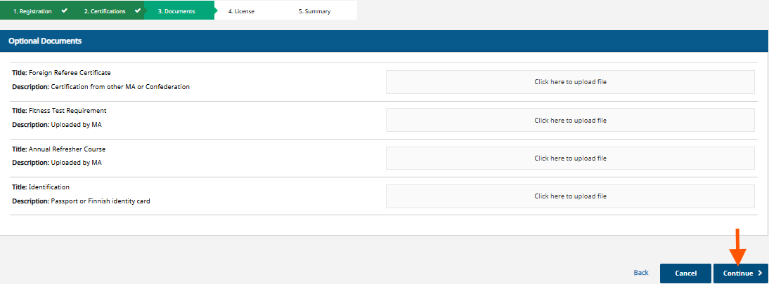 No documents are added at this stage. Select ‘Continue’