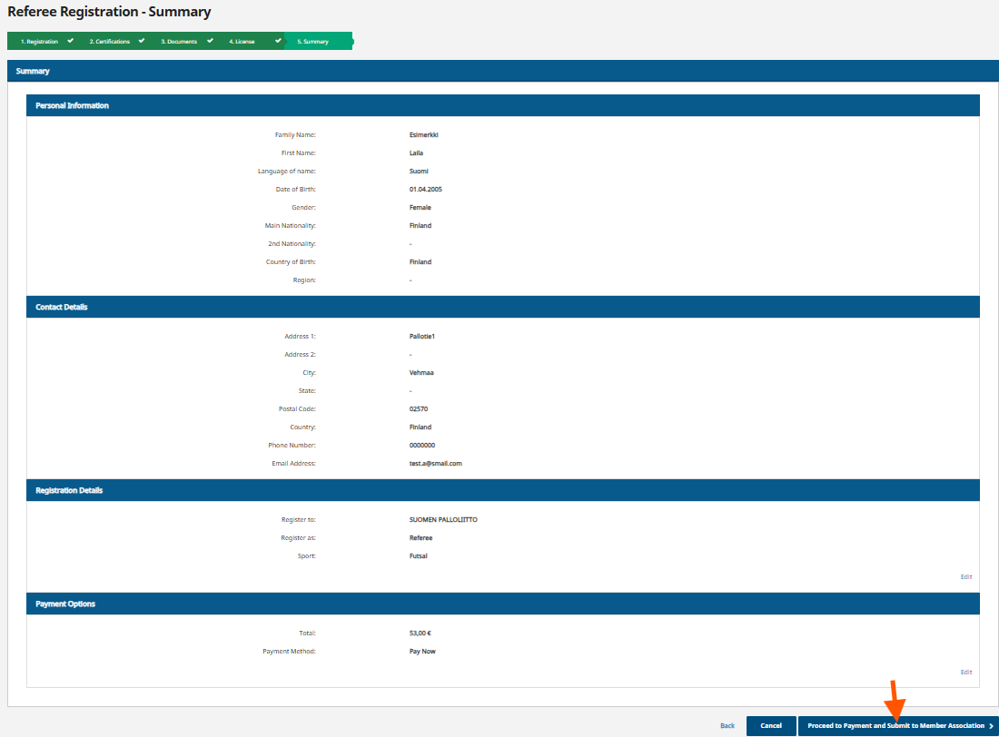 Check on the summary page that the information is correct, and if no changes are needed, select "Continue to payment and Submit to Member Association".