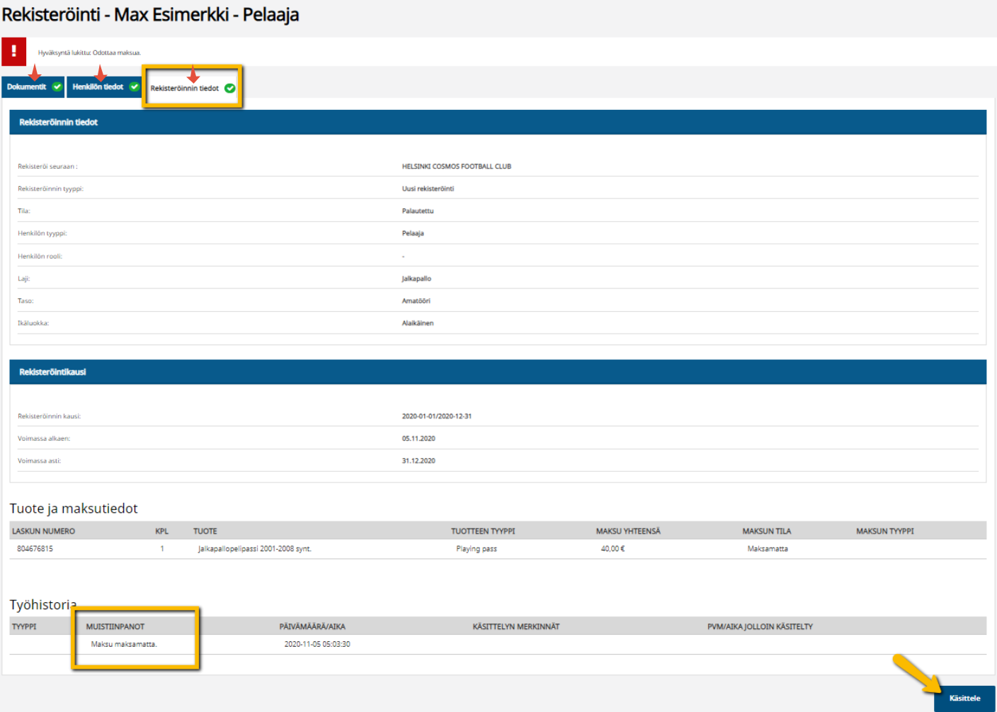 kohdasta 'muistiinpanot' näet miksi rekisteröinti on palautettu.